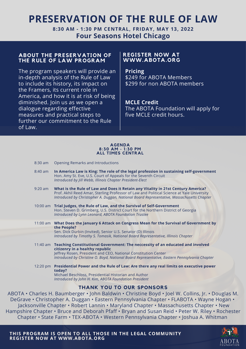 The ABOTA program on preservation of the rule of law will take place at the Four Seasons Hotel in Chicago, and it will be open to ABOTA members and non-members. To register for the event, please visit ABOTA's website.